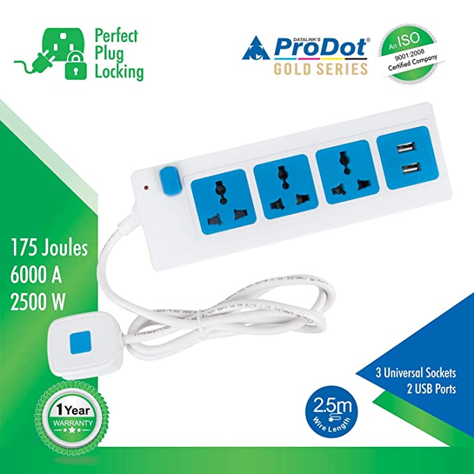 SKU: ProDot 2 USB Ports Strip Surge Protector,(PSP-3S2U-2.5m) Category: Accessories